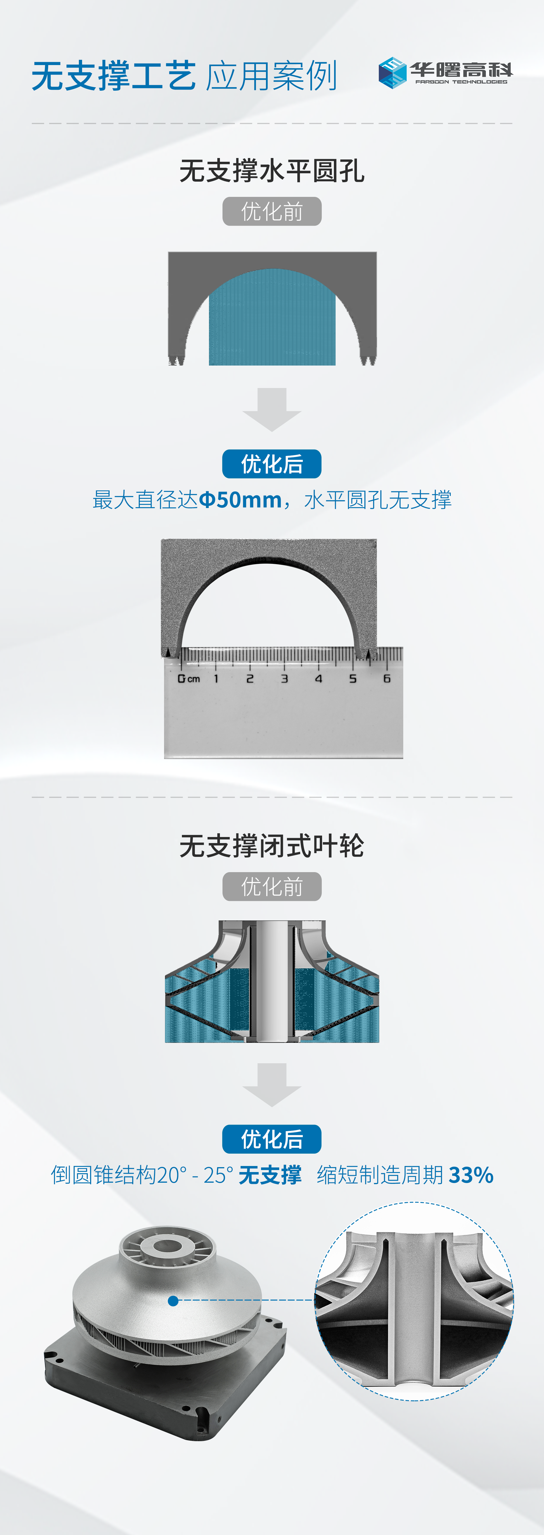 缩短生产及后处理时间,降低生产成本。以直径约130mm,高度约50mm的IN718材料闭式叶轮为例,打印时间可缩短33%,成本可降低约25%以上。对于支撑量更多的零件可节约更多时间及成本。
