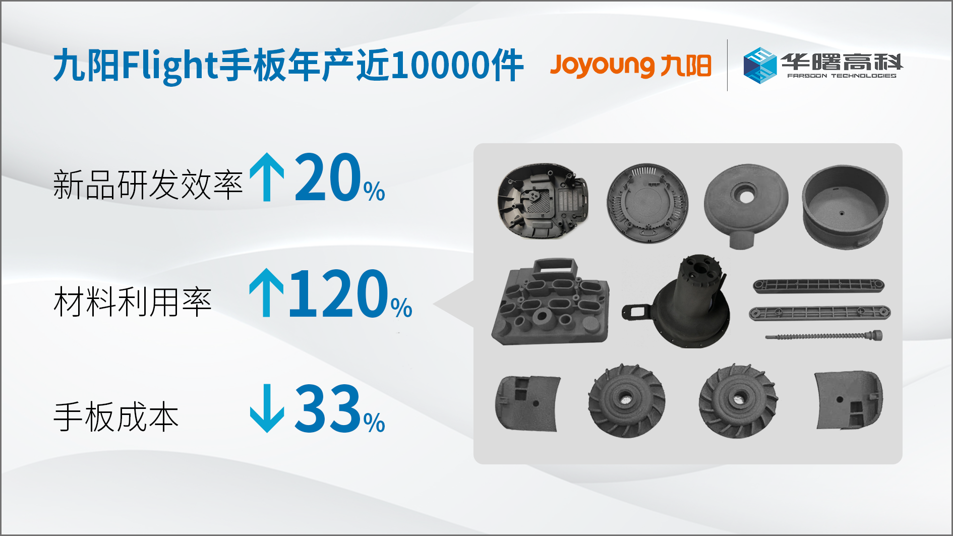 九阳小家电引入华曙高科Flight 403P设备,一年内完成近10000件小家电手板制作,用料超1吨,覆盖研发多关键环节。