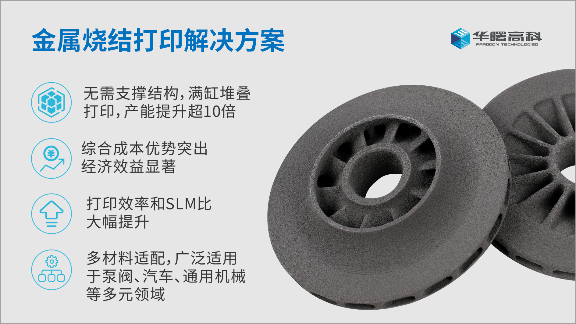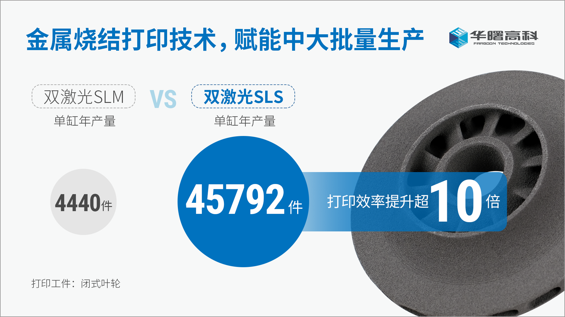 在生产效率上,金属烧结打印解决方案可实现无支撑堆叠排包打印,单台设备年产能可达10万+件,在同等激光器条件下,打印效率较SLM技术提升超10倍。以闭式叶轮为例,采用SLM双激光设备单缸年产量超4000件,而华曙高科SLS双激光设备单缸年产量可突破4万件,适配中大批量生产需求。