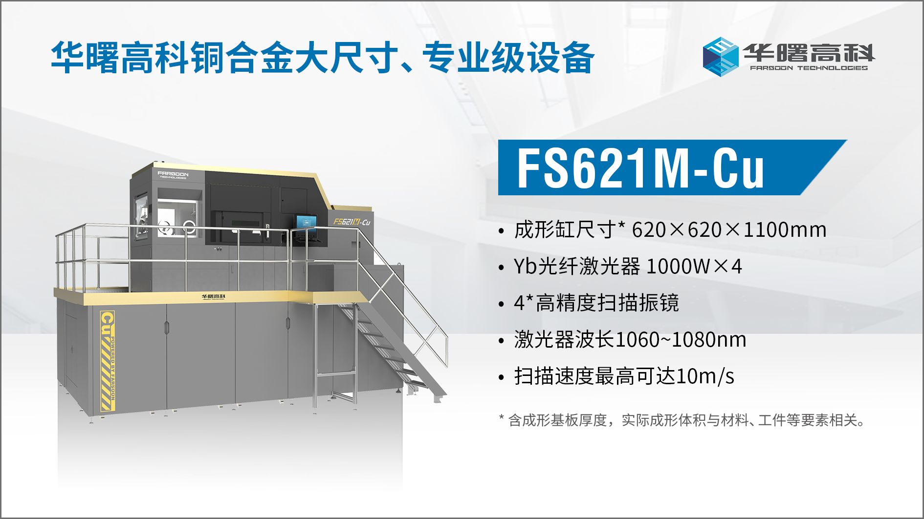 2023年,首都航天机械有限公司携手华曙高科,联合研发出行业内少有的铜合金打印大尺寸、专业级增材制造设备FS621M-Cu,该款设备配置4台1000W掺镱 (Yb) 激光器,激光器波长1060-1080nm,进一步突破了CuCrZr等高反材料大型工件长时间稳定打印课题。